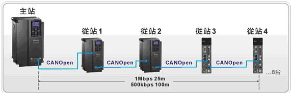 以往的變頻器是扮演純粹驅(qū)動(dòng)的角色,接收上位機(jī)的命令做各種機(jī)械運(yùn)動(dòng),C2000內(nèi)建的PLC功能,同時(shí)支援CANopen通訊機(jī)能,當(dāng)客戶有做兩臺(tái)以上變頻器的應(yīng)用時(shí),只需要透過一臺(tái)C2000做主站,就可以實(shí)現(xiàn)最多同時(shí)/控制8臺(tái)C2000或ASDA-A2伺服的應(yīng)用,還可以利用分散式I/O的方式來控制遠(yuǎn)程I/O節(jié)點(diǎn),增加主機(jī) I/O。
