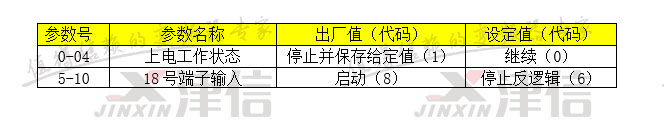 2.外部12 ,18號端子接起停控制開關。 3. 通過面板按下面的參數分別在0號菜單設置上電工作狀態(tài),5號菜單設置18號端子輸入值。