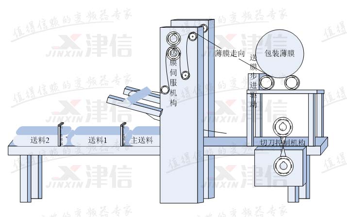 送膜控制有定長送膜和色標對標送膜兩種情況。定長送膜,只需根據主軸編碼器信號,主軸轉一圈(輸送一個物料),送膜部分輸送一段固定長度的膜即可,不需動態調整;色標對標送膜,不但要求主軸轉一圈輸送一段固定長度的膜,還要求膜上的色標點正好落在主軸的設定相位點上,以使橫切刀能精確地切在色標點上。因此色標對標送膜還需要根據檢測到的實際色標相位差,在生產過程中動態調整送膜電機的相位。