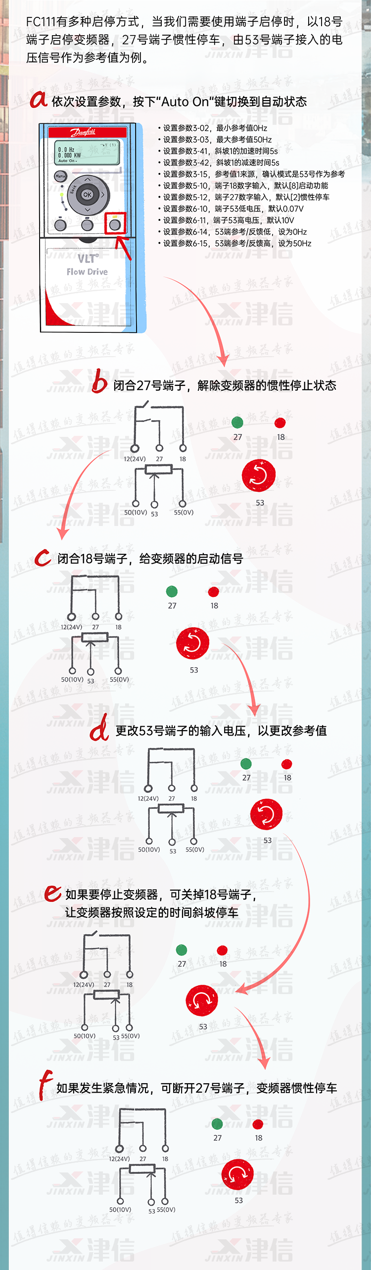 丹佛斯變頻器有多種啟停方式,以丹佛斯FC111變頻器為例,當我們需要使用端子啟停時,以18號端子啟停變頻器,27號端子慣性停車,由53號端子接入的電壓信號作為參考值為例。