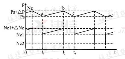圖1給出了λ = 0.7,Q0 = 10Q1時空壓機的功耗和壓力變化關系趨勢圖。式中Q0為空壓機配套的儲氣罐容積,ps為滿足用戶需要的最低壓力,Nz1為空壓機供氣壓力在 ps時恒速運行的功耗,psp為空壓機運行的最高壓力,其中Δp為壓力控制器的差動壓力,Nz1+ΔNz為空壓機在供氣壓力為psp時的功耗,Nz2 為空壓機在空載時恒速運行的功耗。從圖1中可以看到,當壓力由a點上升到b點,空壓機的功耗由Nz1上升到Nz1+ΔNz,顯然空壓機功耗的增加是由于Q2和Q1不相等造成供氣壓力上升所造成的,這可以從公式Nz=Mτ×n/973.2得到證明,式中Nz表示空壓機軸功率,Mτ表示空壓機轉矩,n表示空壓機轉速。當壓力上升時 , 由于轉矩和 壓力成正比關系 , 空壓機轉矩也隨之上升 , 從而導致 空壓機軸功率上升 ; 當壓力上升到b點后,壓力控制 器觸發電磁閥關閉空壓機進氣,這時空壓機進入空載狀態運行,其功耗為Nz2 ,同時供氣壓力也開始下降,在供氣壓力下降到C點之前,空壓機一直維持在功耗為Nz2的空載運行狀態;當壓力下降到C點后,壓力控制器觸發電磁閥打開空壓機進氣,空壓機重新進入壓力上升階段,如此循環往復。