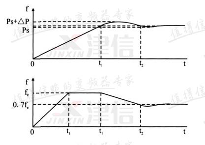 目前,變頻螺桿空壓機的運行頻率大多是由變頻器根據用戶設定的期望壓力和供氣端反饋的實時壓力的差值進行自動調節。當供氣端反饋的實時壓力超過用戶設定的期望壓力時,變頻器減小輸出頻率,反之,則增大輸出頻率;而當供氣端反饋的實時壓力等于用戶設定的期望壓力時,變頻器維持當前輸出頻率。圖3給出了λ = 0.7,Q0 = 10Q1 時變頻螺桿空壓機的供氣壓力和變頻器輸出頻率變化關系趨勢圖。從圖3中可以看到, 變頻螺桿空壓機起動后其輸出頻率平穩上升至額定頻率fe(軟起動方式,起動時間t0可調),然后維持額定頻率運行,供氣壓力也隨之上升,當壓力上升到用戶設定的期望壓力ps時(t1),空壓機輸出頻率開始下降,由于慣性壓力還會有一點超調量Δp,通常 Δp<5%ps。隨著輸出頻率繼續下降,空壓機的供氣量也隨之下降,供氣壓力最終降至期望壓力ps處,這時輸出頻率也維持相對穩定狀態。在變頻螺桿空壓機的運行中,一旦出現供氣量發生變化導致供氣壓力變化時,變頻器會立即調節輸出頻率使供氣壓力維持在ps處。總之,對于變頻螺桿空壓機來說,除非它的供氣量是絕對不變的,否則其運行過程就是一個動態平衡過程,就是系統的輸出頻率在上限和下限頻率之間不斷地變化以尋求氣量供需平衡的過程。