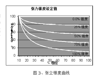 收卷張力錐度控制:有了當(dāng)前卷徑值,和張力錐度設(shè)定值,就能計算當(dāng)前張力。張力與卷徑的關(guān)系如圖3所示,當(dāng)張力錐度為0時,張力保持恒定不變,相當(dāng)于恒張力控制;當(dāng)張力錐度為100%時,卷徑每增大1倍,張力就下降一半,相當(dāng)于恒轉(zhuǎn)矩控制。計算公式如下: