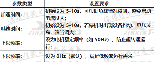 — 點動(JOG)參數:設置點動頻率(5-10Hz)、點動加減速時間(2-3s),方便現場轉向測試;