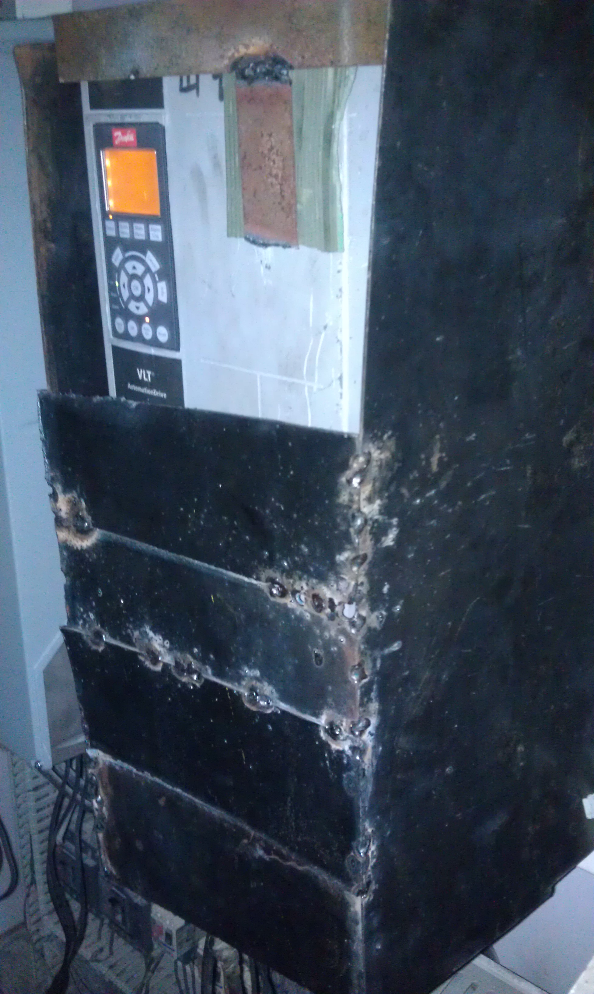 最后通過以上分析,現(xiàn)場(chǎng)服務(wù)工程師決定對(duì)新變頻器做一個(gè)磁場(chǎng)屏蔽的實(shí)驗(yàn),做一個(gè)鐵的環(huán)形屏蔽,如圖所示,設(shè)備重啟后馬上就運(yùn)行正常了,并且連續(xù)運(yùn)行了16個(gè)小時(shí),期間無任何故障報(bào)警,一切運(yùn)轉(zhuǎn)正常。